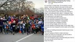 Runners offended by Massapequa Thanksgiving Day Turkey Trot's Facebook post. Email ... It's an annual tradition in Massapequa, but a Facebook post has everyone squabbling over this year's run. ... But their last-minute race instructions, posted on Facebook, are being seen by many as elitist and rude.