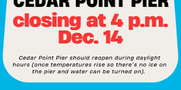 Closing early for freeze: Cedar Point Pier - FOX10 News MOBILE COUNTY, Ala. (WALA) -The Cedar Point Pier Facebook page says the pier will close early Sunday because of expected freezing conditions.